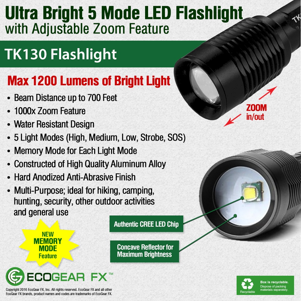 The TK130 LED Flashlight offers multiple light modes and delivers excellent light spread when using the adjustable zoom focus feature. Made of aircraft grade aluminum alloy, the TK130 is a reliable battery-powered AAA flashlight with a zoom focus beam ideal for many situations. The TK130 Flashlight gives you high-strength and durability and is perfect camping, hunting, fishing and multiple other activities. It is also a very useful LED emergency flashlight to aid in emergency assistance and natural disasters including earthquakes, hurricanes and storms.